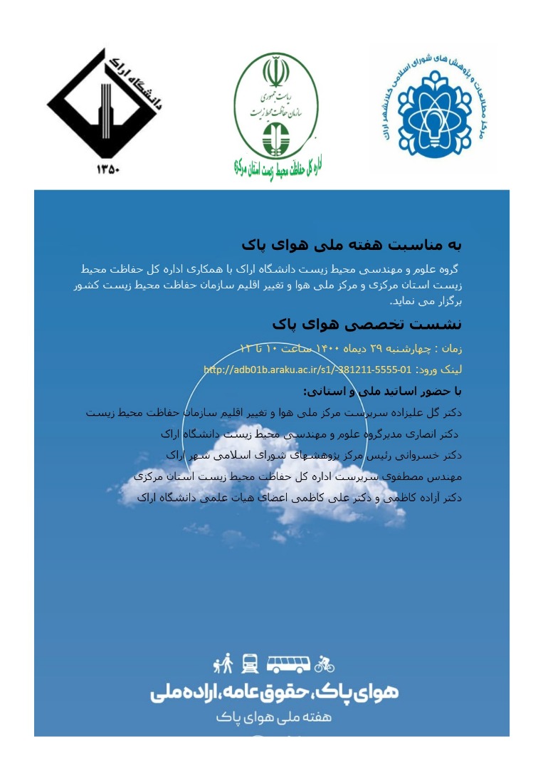نشست تخصصی ۲۹ دی ماه روز هوای پاک با شعار "هوای پاک، حقوق عامه، اراده ملی" توسط گروه علوم و مهندسی محیط زیست دانشگاه اراک با همکاری اداره کل حفاظت محیط زیست استان مرکزی و مرکز ملی هوا و تغییر اقلیم سازمان حفاظت محیط زیست کشور و مرکز پژوهشهای شورای اسلامی شهر اراک برگزار میگردد.