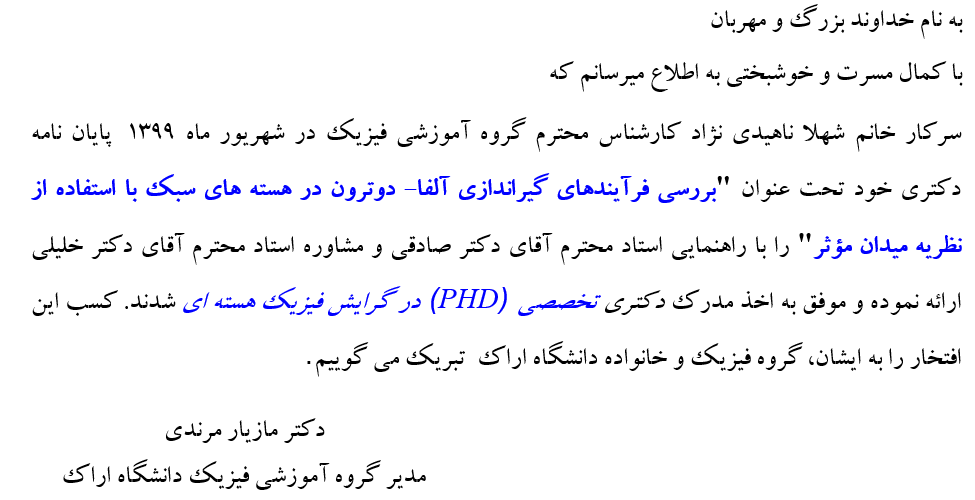 سرکار خانم شهلا ناهیدی نژاد کارشناس محترم گروه آموزشی فیزیک در شهریور ماه ۱۳۹۹ پایان نامه دکتری خود تحت عنوان بررسی فرآیندهای گیراندازی آلفا- دوترون در هسته های سبک با استفاده از نظریه میدان مؤثر را با راهنمایی استاد محترم آقای دکتر صادقی و مشاوره استاد محترم آقای دکتر خلیلی ارائه نموده و موفق به اخذ مدرک دکتری تخصصی (PHD) در گرایش فیزیک هسته ای شدند.