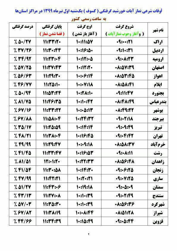 پدیده خورشید گرفتگی یکشنبه مورخ 1399/4/1 (21 ژو.ئن 2020) با زیبایی زیادی شکل گرفت که در اکثر نقاط ایران مطابق جدول زیر قابل رویت بود.