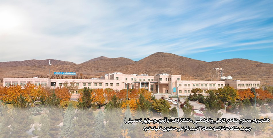 -- داوطلبانی که قبولی  پیش دانشگاهی خود را تا پایان شهریور ماه 1399 دریافت ننموده اند در حال حاضر مجاز به ورود به سامانه ثبت نام غیرحضوری جهت انجام ثبت نام الکترونیکی نمی باشند و درصورت ثبت نام غیر مجاز برابر مقررات مورد رسیدگی قرار خواهند گرفت ولی باعنایت به پذیرش کلیه رشته های دانشگاه اراک در نیمسال دوم ، در صورت دریافت مدرک پیش دانشگاهی یا پایان تحصیلات دوره دوم متوسطه حداکثر تا مورخ 30/11/1399 ، لزوماً پس از دریافت گواهی پایان تحصیلات با همراه داشتن کلیه مدارک مندرج در اطلاعیه شخصاً جهت ثبت نام به اداره کل امور آموزشی دانشگاه واقع در سردشت ساختمان دکتر قریب طبقه اول مراجعه نمایند .